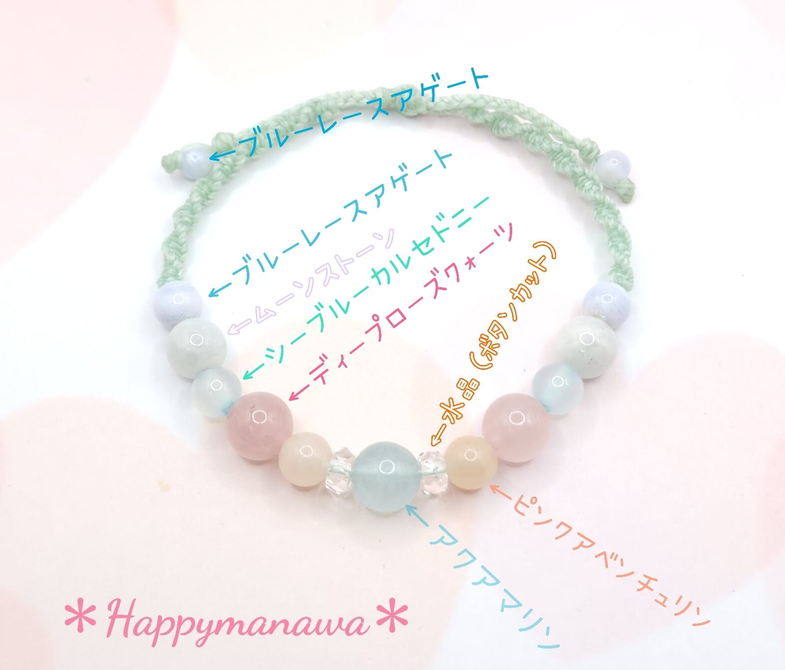 天然石のやさしい色合いとマクラメ編みが魅力のブレスレットです。使用している天然石は、アクアマリン、水晶、ピンクアベンチュリン、ディープローズクォーツ、シーブルーカルセドニー、ムーンストーン、ブルーレースアゲートと豊富な種類を揃えています。それぞれの石には意味があるため、身につけることで気持ちが落ち着いたり、運気をアップさせることができると言われています。