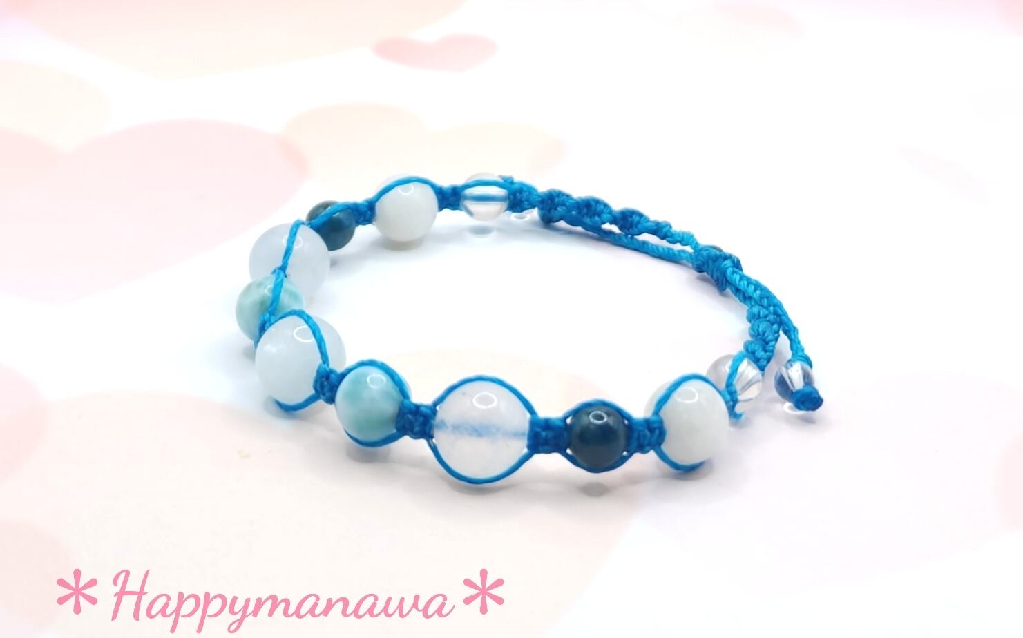 アクアマリン、ラリマー、ホワイトラブラドライト、アパタイト、ムーンストーン、シャンパンオーラ、水晶など、7種類の美しい天然石が織りなす、マクラメ編みのブレスレットです。