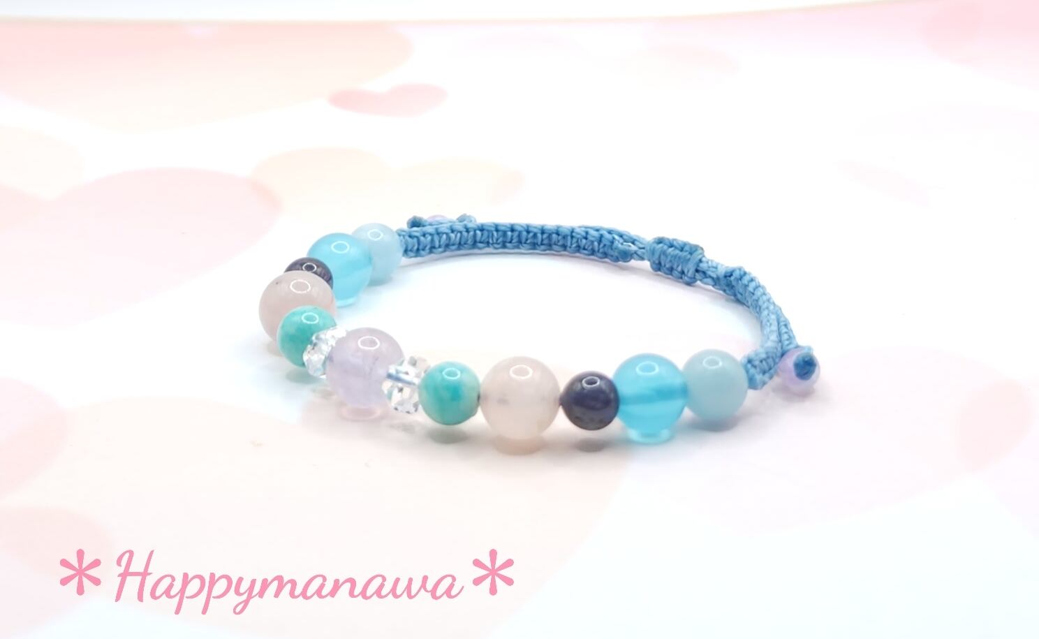 ラベンダーアメジスト、水晶、アマゾナイト、ディープローズクォーツ、タンザナイト、シーブルーカルセドニー、アクアマリンを使用した、マクラメ編みのブレスレットです。