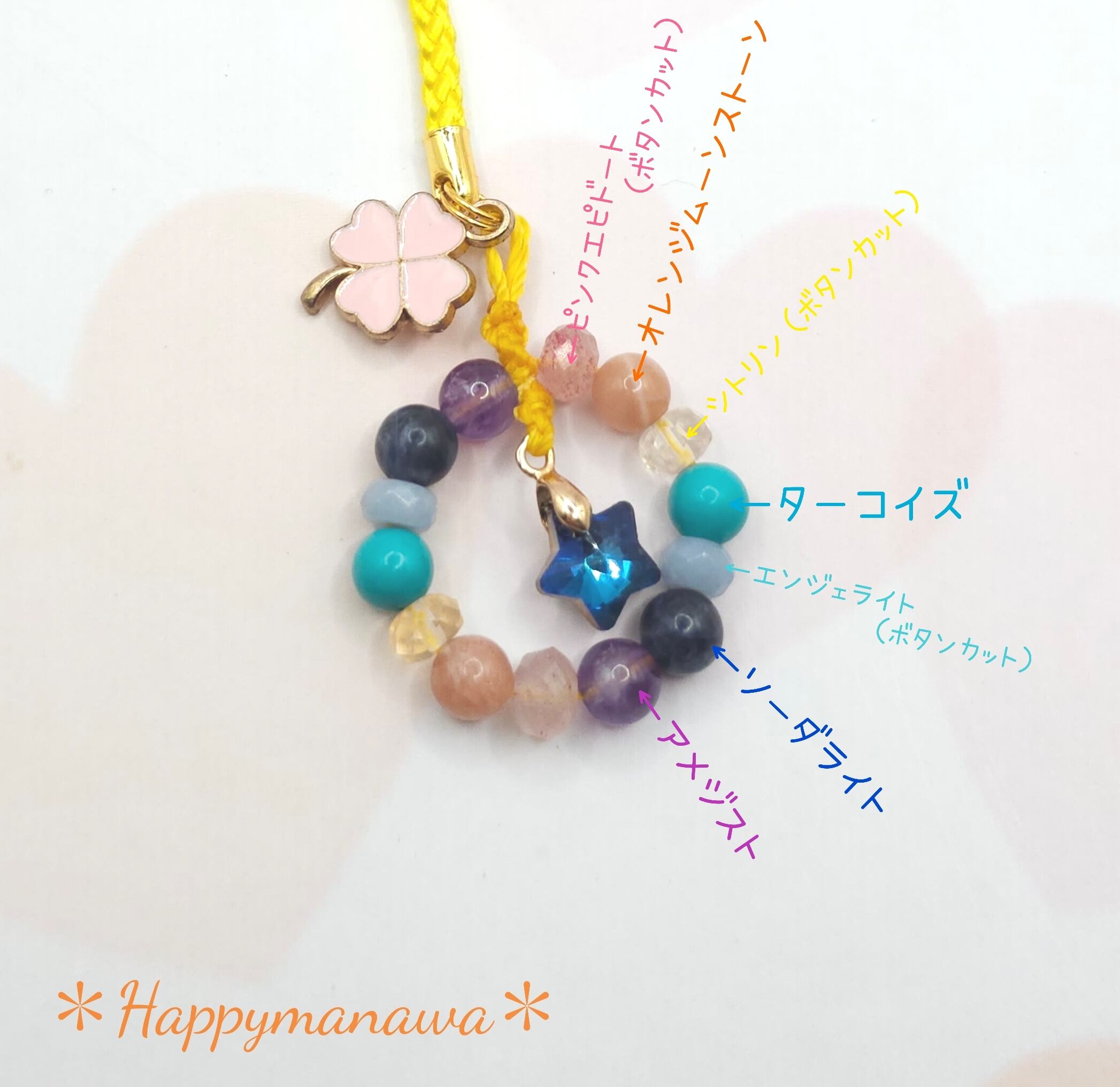 ピンクエピドート、オレンジムーンストーン、シトリン、ターコイズ、エンジェライト、ソーダライト、アメジストの7種類の天然石をマクラメ編みで仕上げたストラップです。天然石にはそれぞれのパワーがあり、身につけることで幸運や癒しをもたらすと言われています。