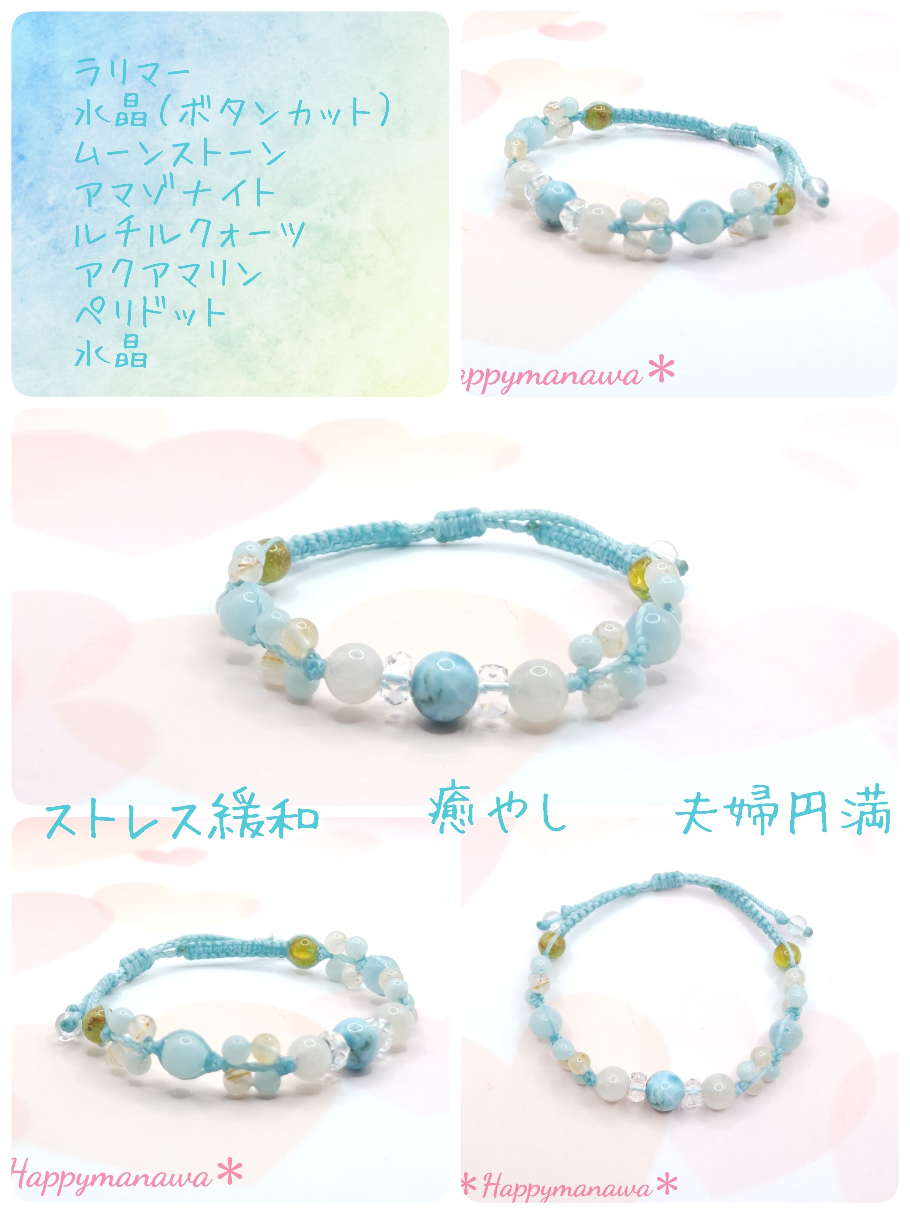 このブレスレットには、ラリマー、水晶、ムーンストーン、アマゾナイト、ルチルクォーツ、アクアマリン、ペリドットなど、様々な種類の天然石が使われています。