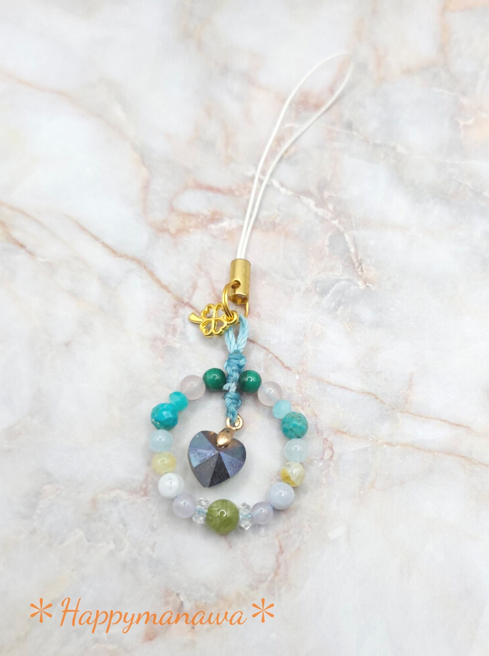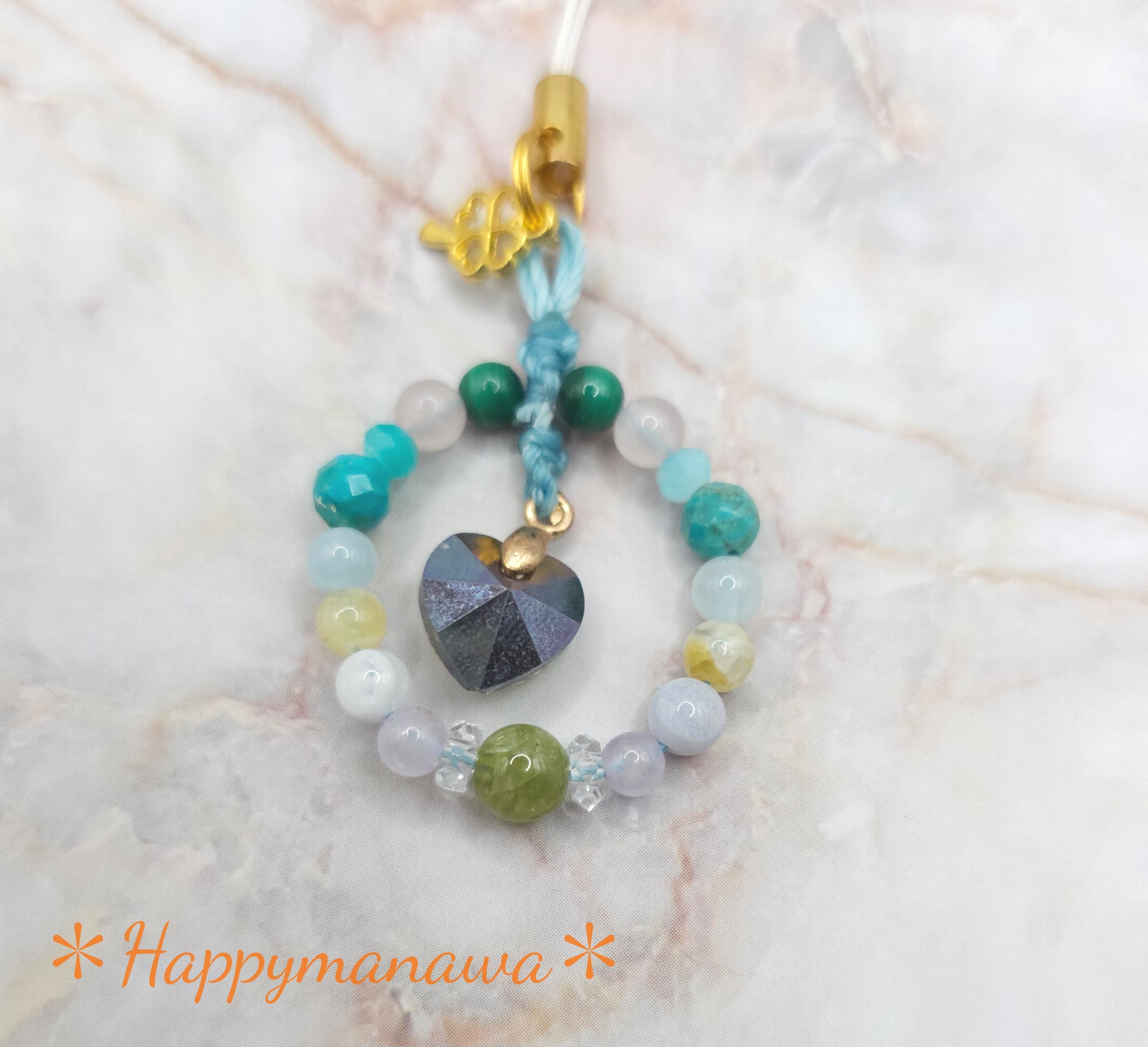 ペリドット、水晶、ラベンダーアメジスト、ブルーレースアゲート、イエローオパール、アクアマリン、ターコイズ、アマゾナイト、ローズクォーツ、マラカイトといった天然石を使用。