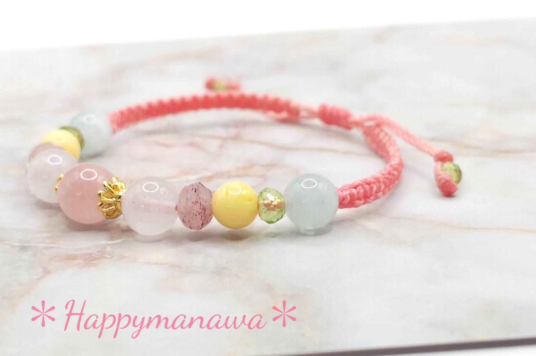 ディープローズクォーツ、ラベンダーアメジスト、ピンクエピドート、アンバー、ペリドット、アクアマリンなど、可愛らしい色合いの天然石が織り成すブレスレットです。