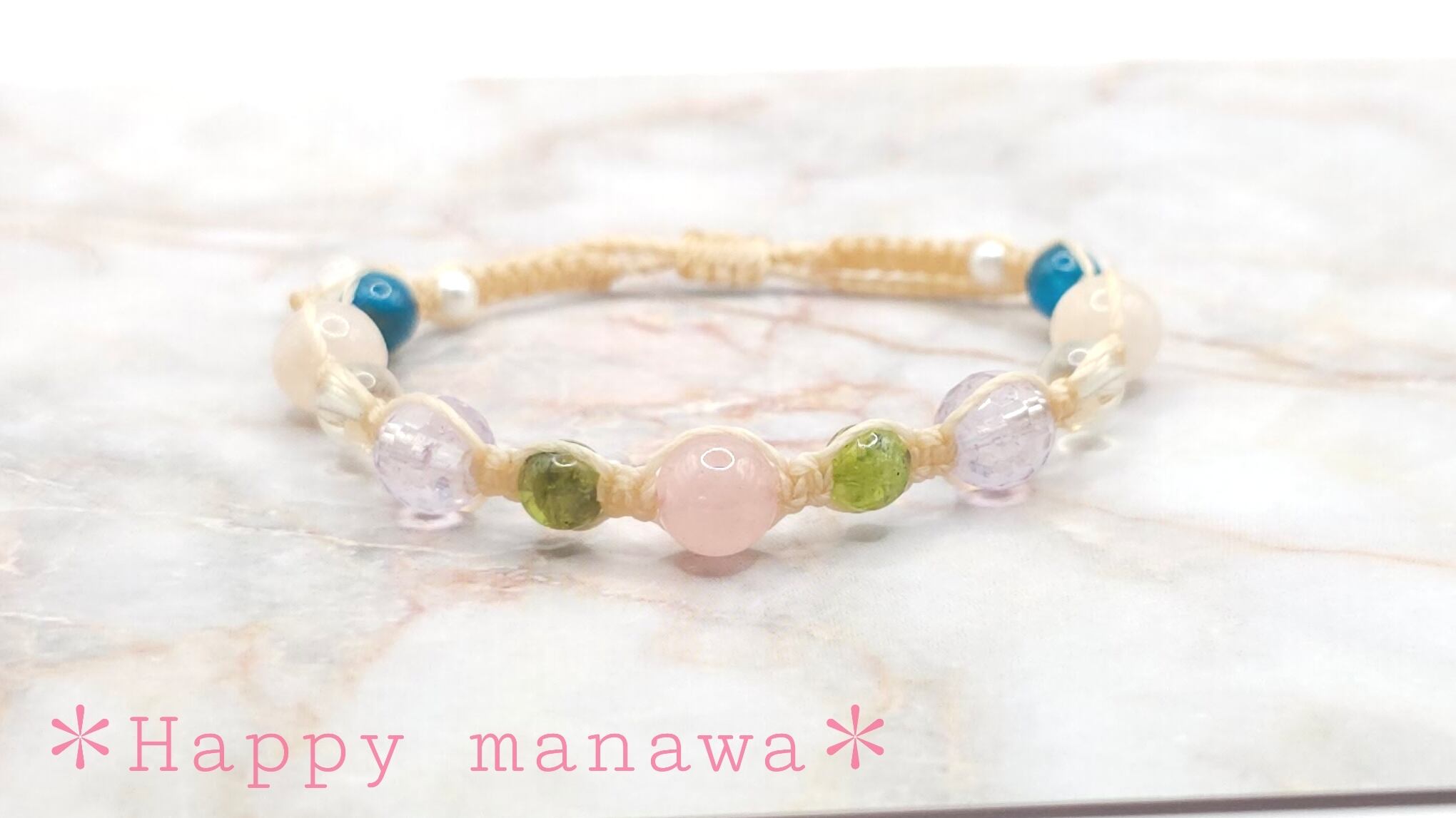 ディープローズクォーツ、ペリドット、ピンクアメジスト、レモンクォーツ、モルガナイト、アパタイト、水晶の美しい天然石を使用したブレスレットです。一つ一つの石は、自然の力を秘めたパワーストーンとして知られています。
