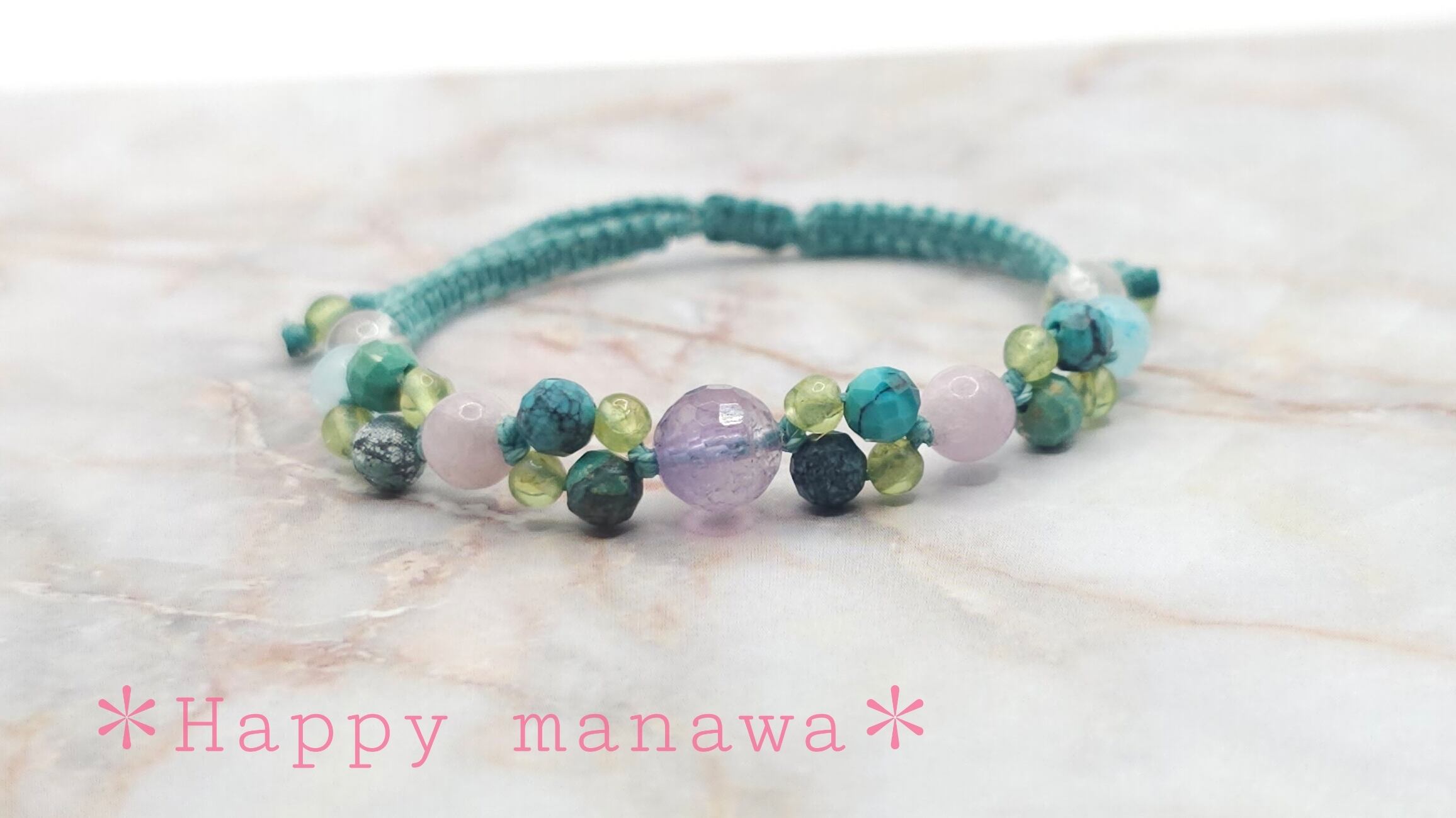 ピンクアメジスト、ターコイズ、ペリドット、クンツァイト、ヘモミルファイト、水晶の6種の石を組み合わせ、マクラメ編みブレスレットです。
