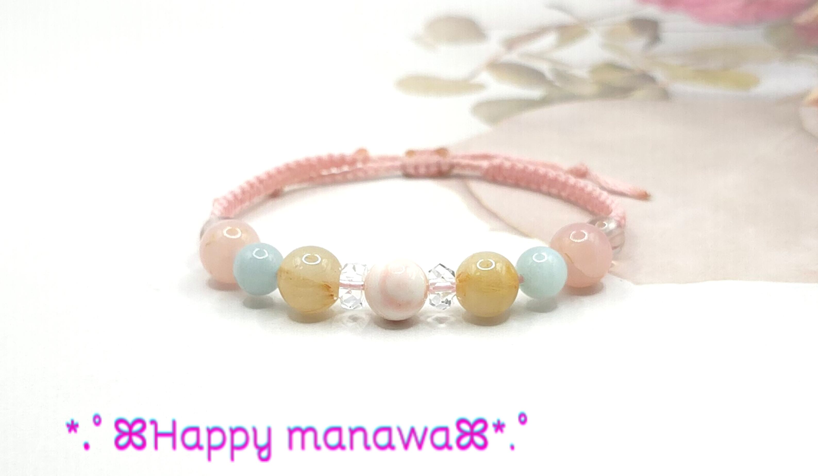 クイーンコンクシェル、水晶、ルチルクォーツ、アクアマリン、ディープローズクォーツ、アメトリンの6種類の天然石を使用し、マクラメ編みで仕上げました。一つ一つの天然石が持つ波動が、身につける人の身体や心を包み込み、癒しの効果を与えてくれます。