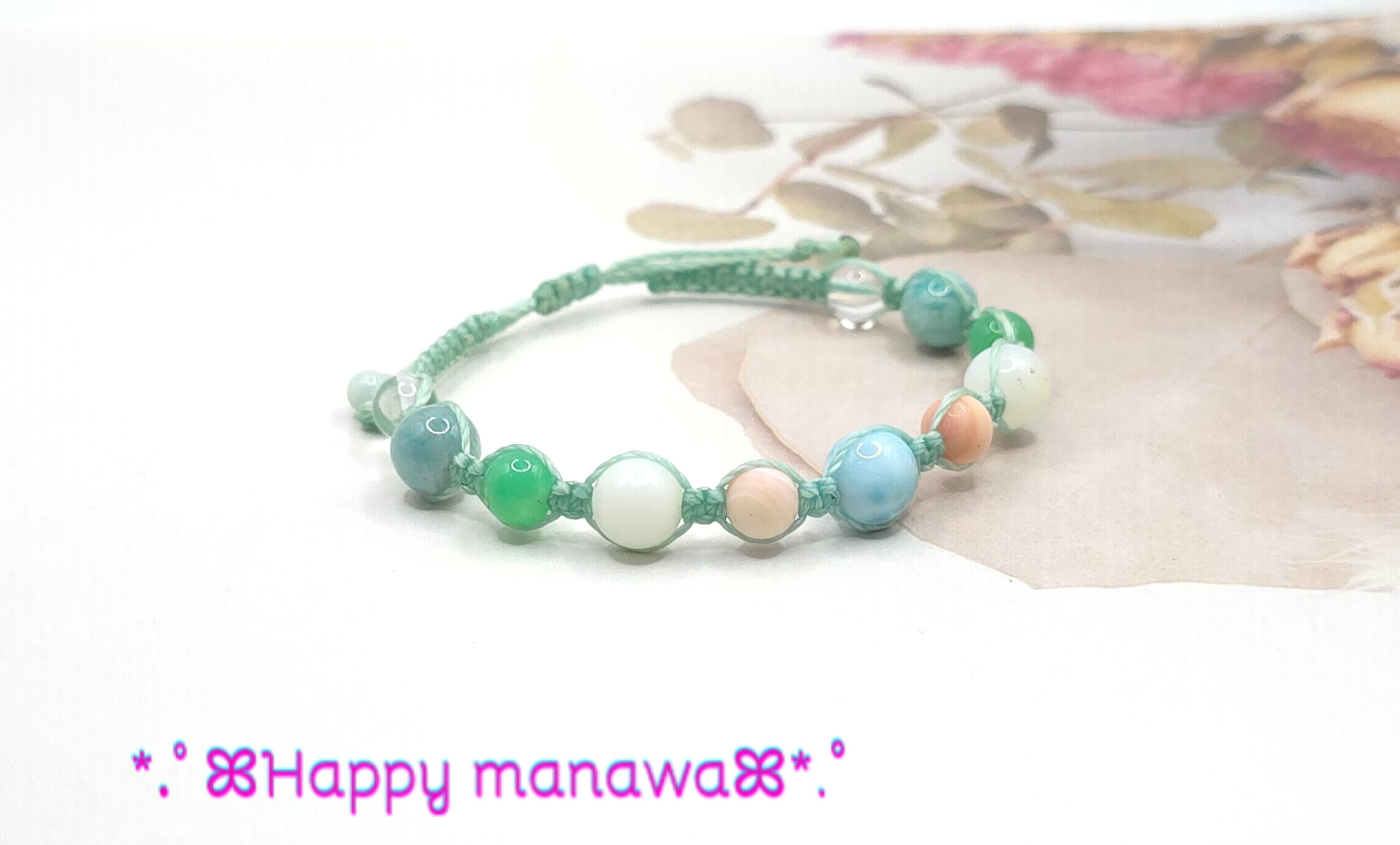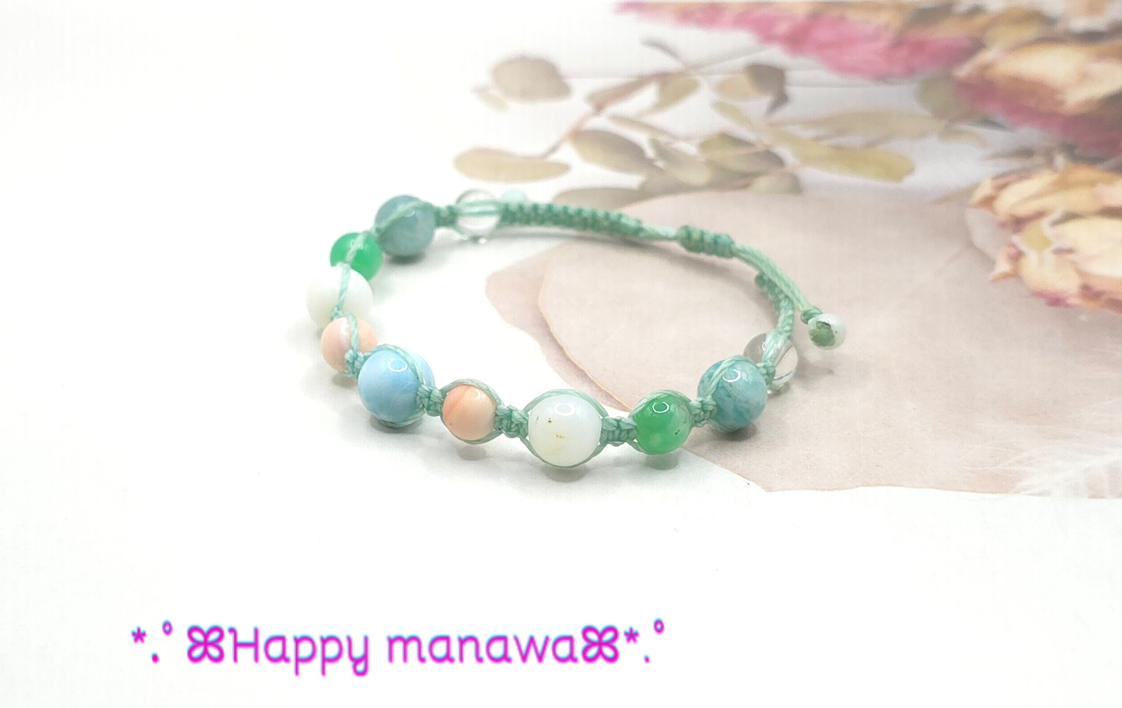 ラリマー、クイーンコンクシェル、ホワイトオパール、アマゾナイト、クリソプレーズ、水晶の美しい天然石を使用した、マクラメ編みのブレスレットです。